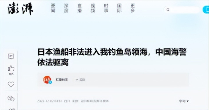 澎湃新闻《日本渔船非法进入我钓鱼岛领海,中国海警依法驱离》