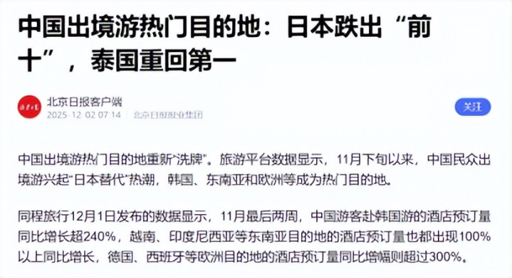最后,说一下日本“失去的航班”去哪里了,旅游平台数据显示,11月下旬以来,中国民众出境游兴起“日本替代”热潮,韩国、东南亚和欧洲等成为热门目的地。