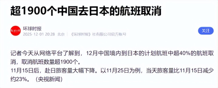 根据数据显示,12月已经有着超过1900个航班被取消,这一数字比前段时间爆出来的904更多,但是这也符合预料,因为11月月末后,高市早苗政府方面的挑衅就开始增多了。